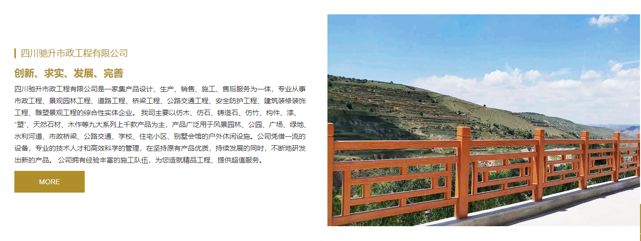 美麗鄉村仿木護欄的建設(shè)一般(bān)仿木護欄分兩大(dà)類,一種是現場製作的純手工仿木護欄,優點是施工方便,不需要運(yùn)輸,直接在現場買材料,水(shuǐ)泥鋼筋(jīn)電焊網等(děng)材(cái)料進行現場施工,而且也避免了模(mó)具生產的(de)仿木欄杆在(zài)運料的過程中發生破損的情況,所用材料看的見,做出來的仿木護欄一個整體,無接縫。